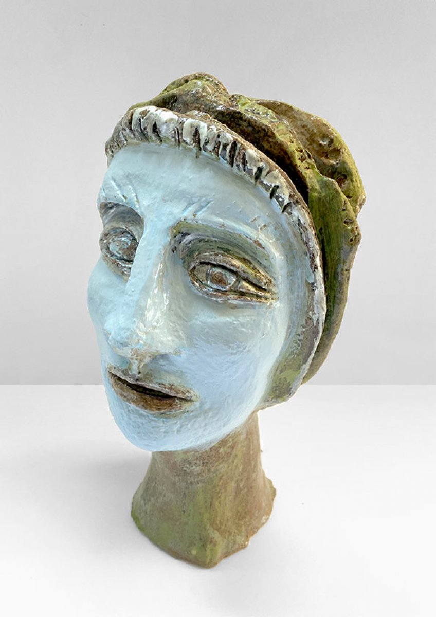 Weiblicher Kopf, 1998, Ton, Rakubrand glasiert, 29 x 15 x 12 cm