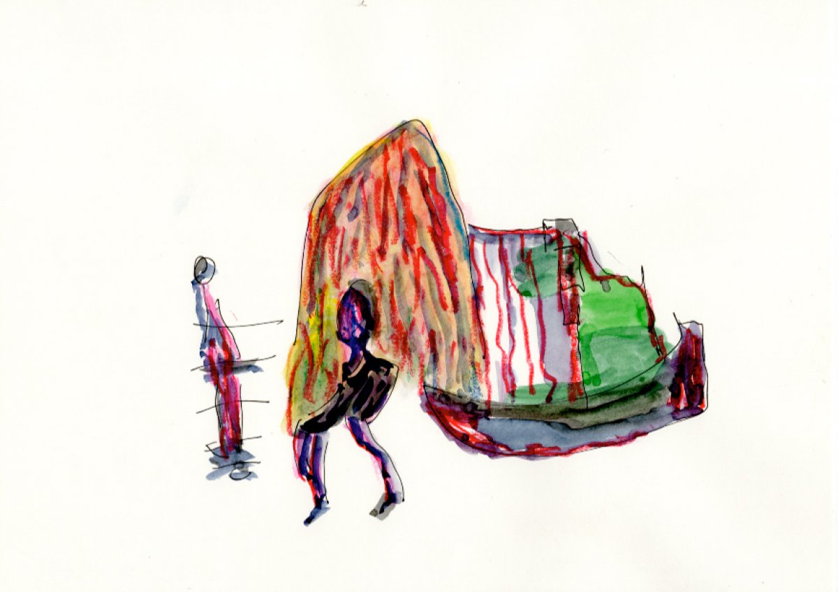 Robinson und Freitag, 2025, Aquarell und Stift auf Papier, 21 x 29,7 cm